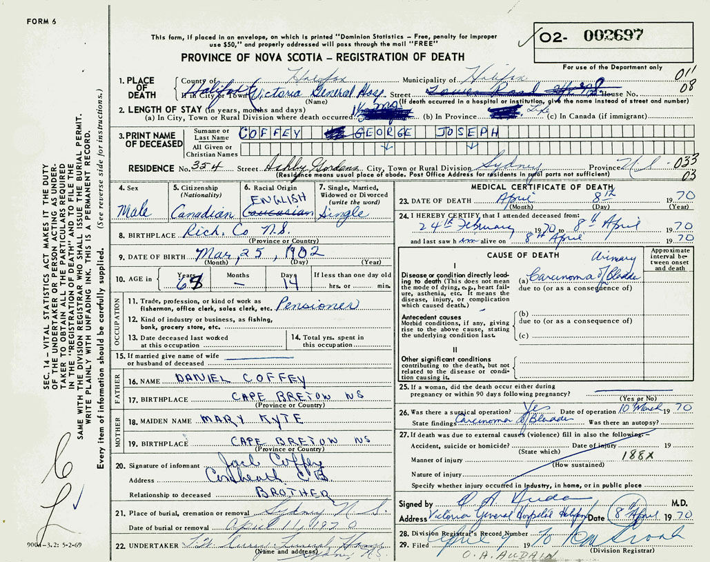 PROVINCE OF NOVA SCOTIA — REGISTRATION OF DEATH