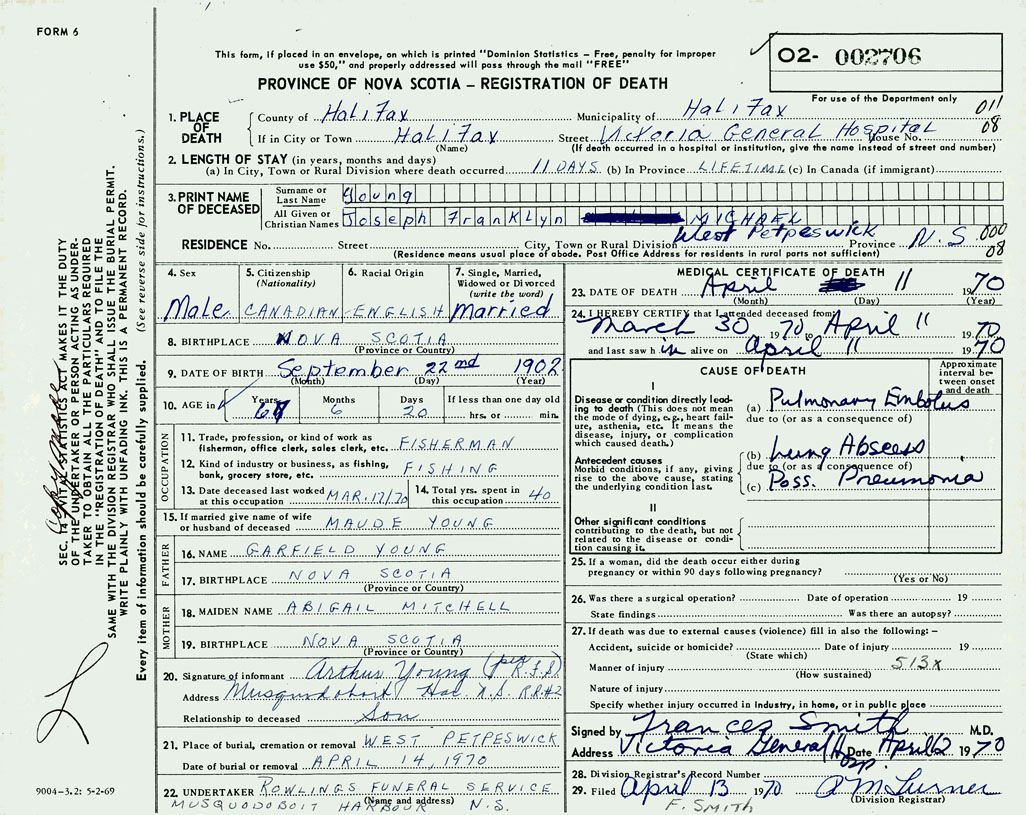 PROVINCE OF NOVA SCOTIA — REGISTRATION OF DEATH
