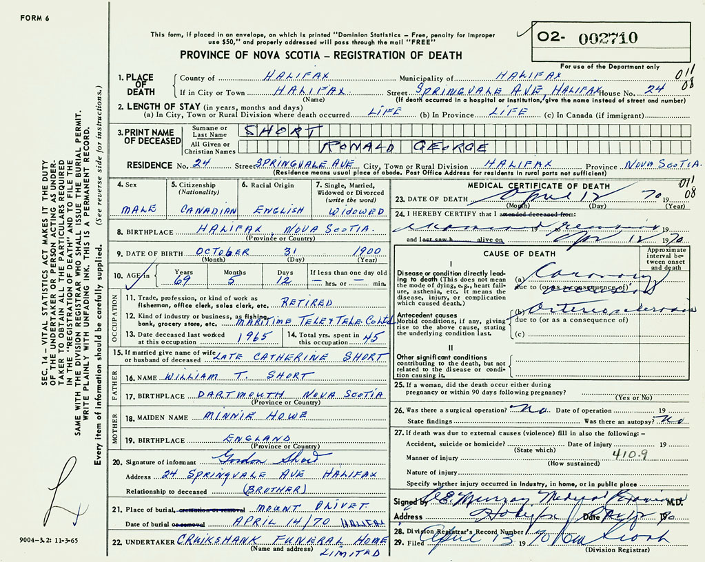 PROVINCE OF NOVA SCOTIA — REGISTRATION OF DEATH