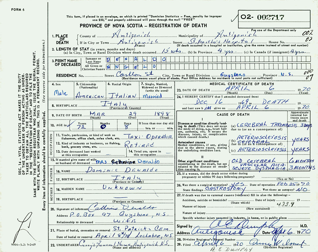 PROVINCE OF NOVA SCOTIA — REGISTRATION OF DEATH