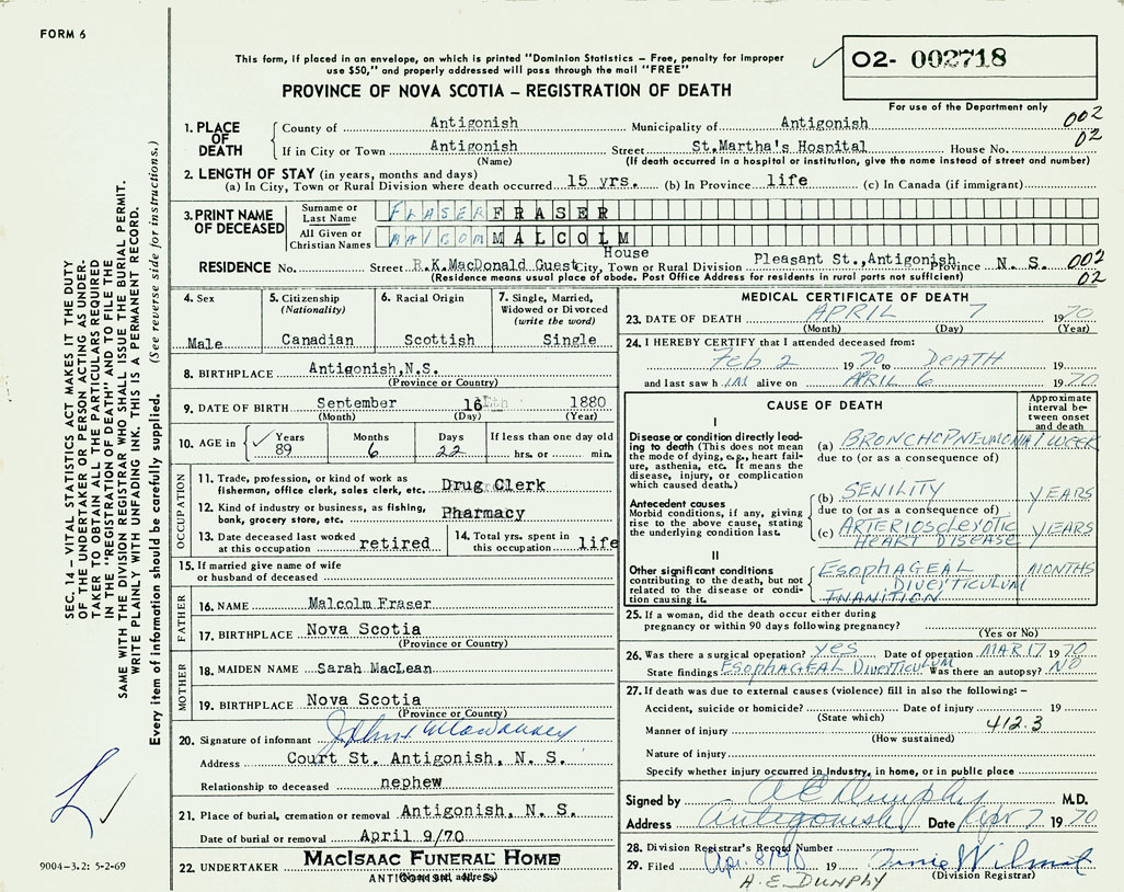 1. PLACE OF DEATH County of Antigonish If in City or Town Antigonish