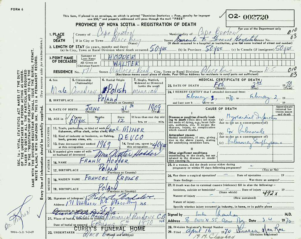 1. PLACE OF DEATH County of Cape Breton If in City or Town Glace Bay