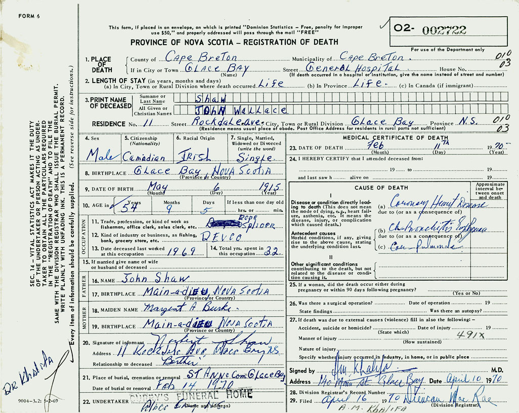 1. PLACE OF DEATH County of Cape Breton If in City or Town Glace Bay