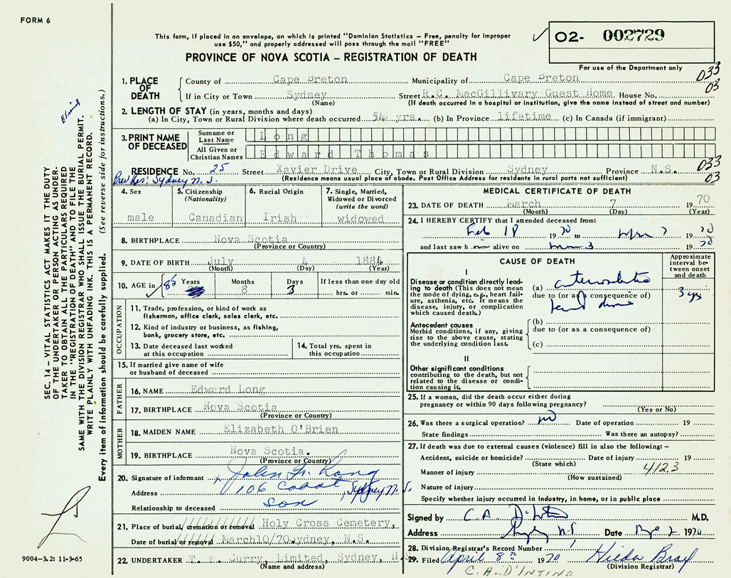 PROVINCE OF NOVA SCOTIA — REGISTRATION OF DEATH