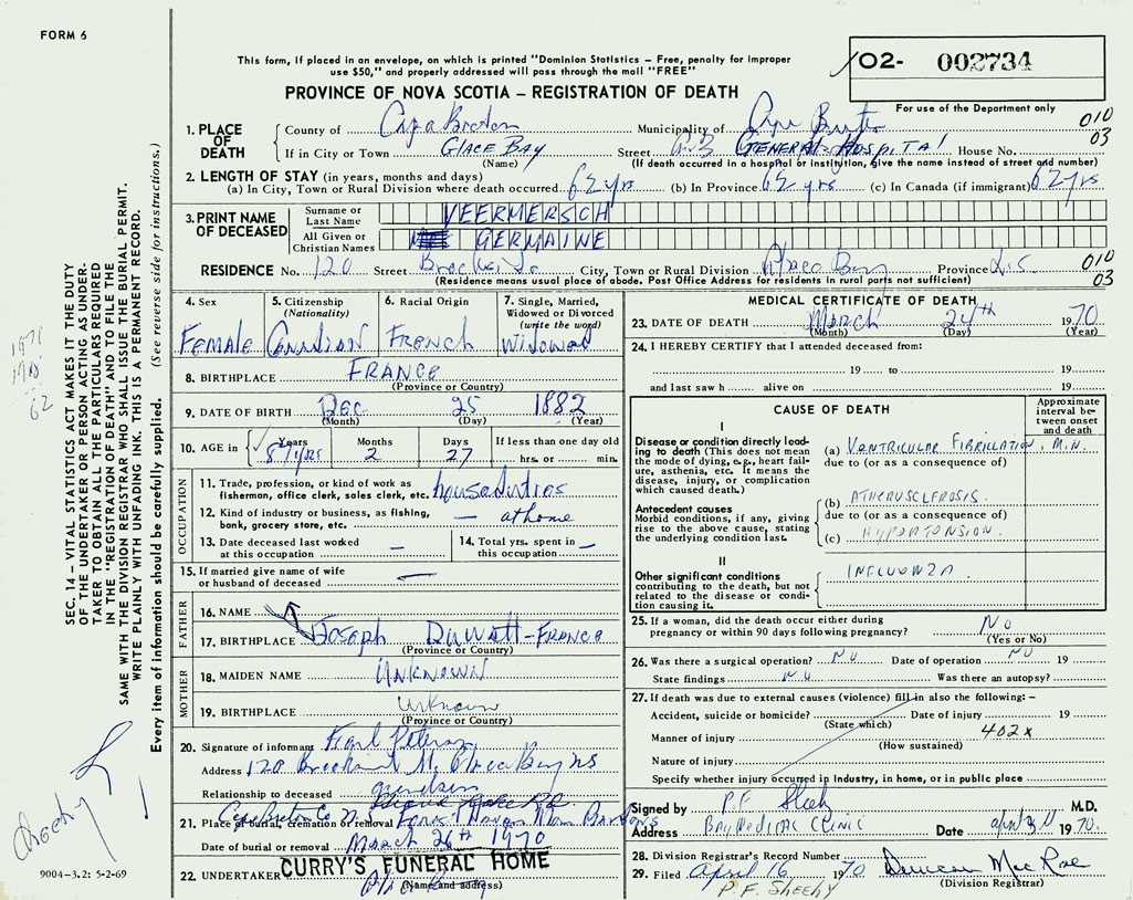 1. PLACE OF DEATH County of Cape Breton If in City or Town Glace Bay
