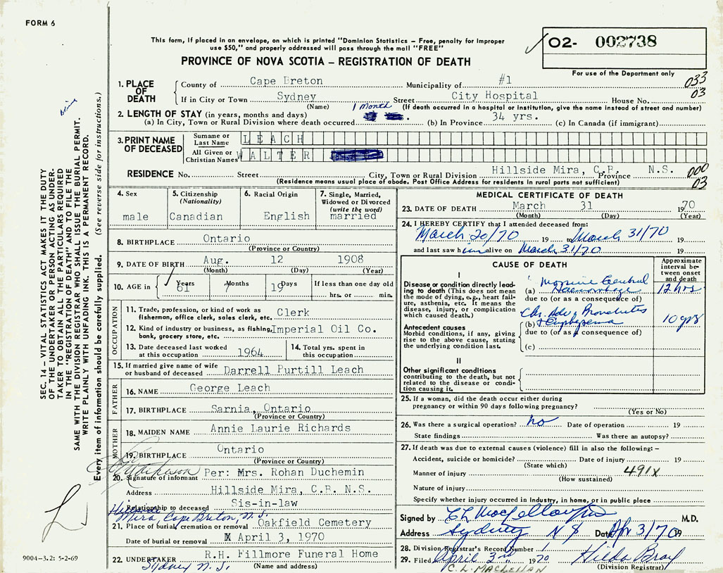 PROVINCE OF NOVA SCOTIA — REGISTRATION OF DEATH