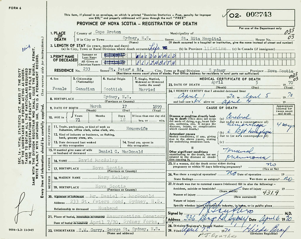 1. PLACE OF DEATH County of Cape Breton If in City or Town Sydney
