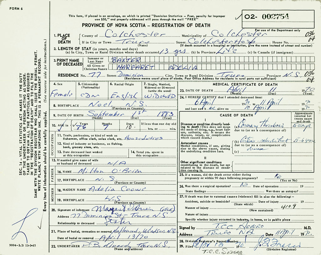 PROVINCE OF NOVA SCOTIA — REGISTRATION OF DEATH