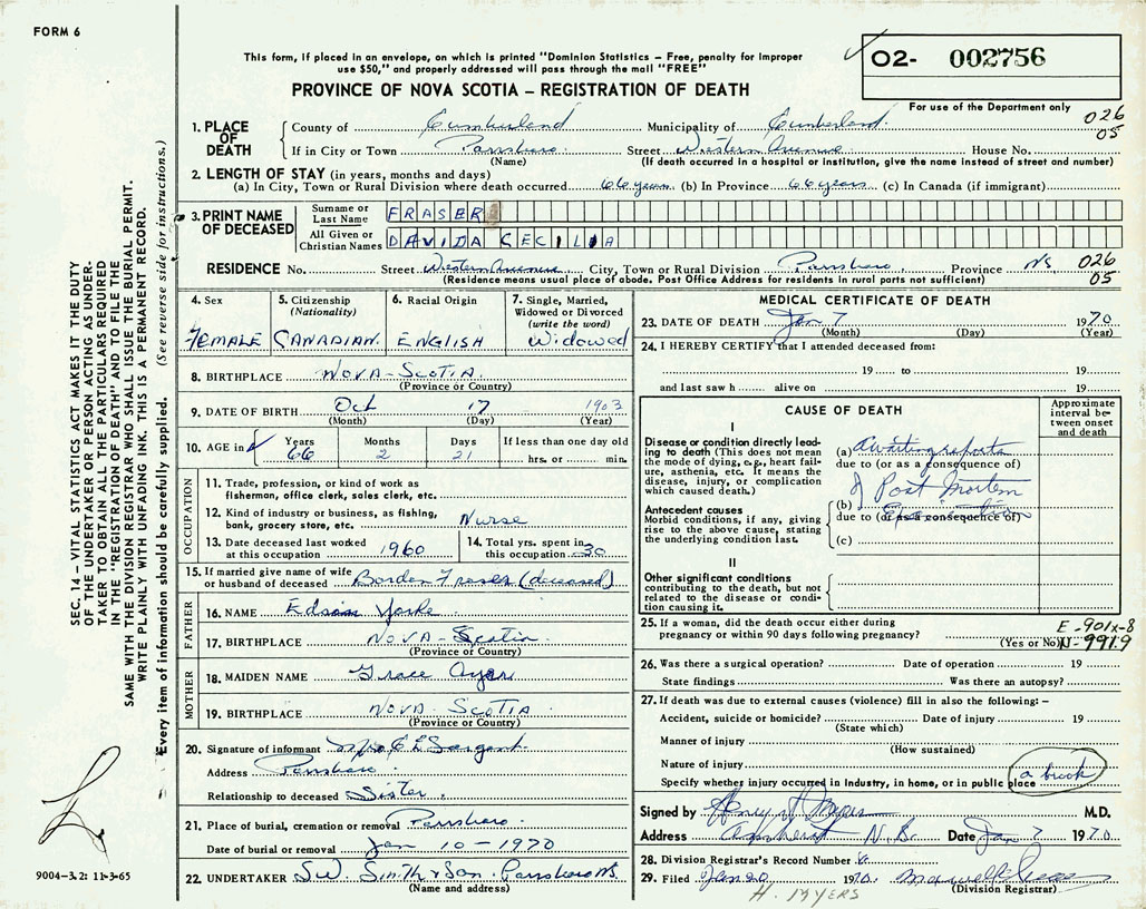PROVINCE OF NOVA SCOTIA — REGISTRATION OF DEATH
