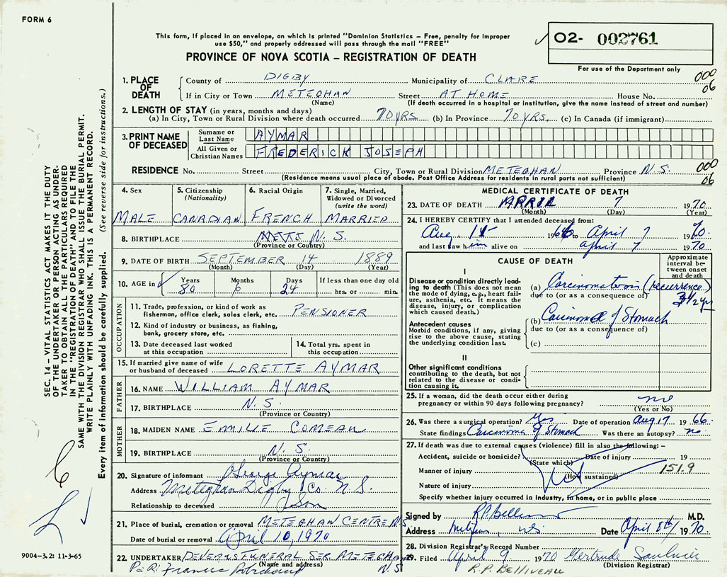 21. Place of burial Meteghan Centre