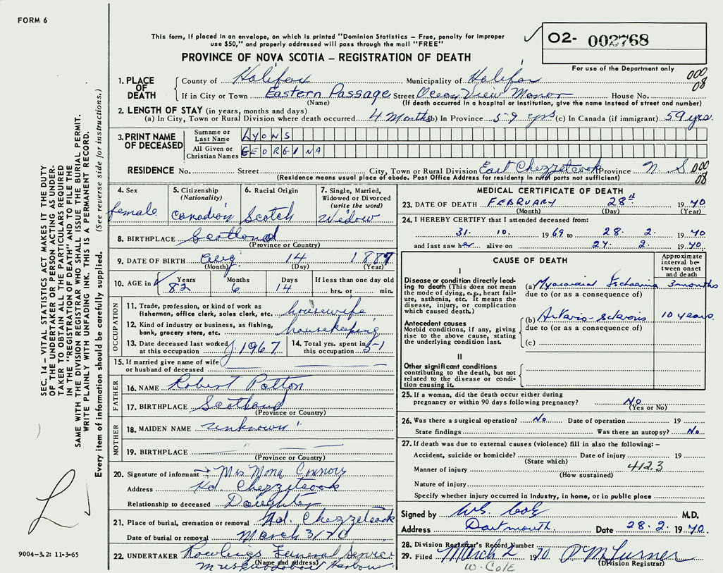 PROVINCE OF NOVA SCOTIA — REGISTRATION OF DEATH