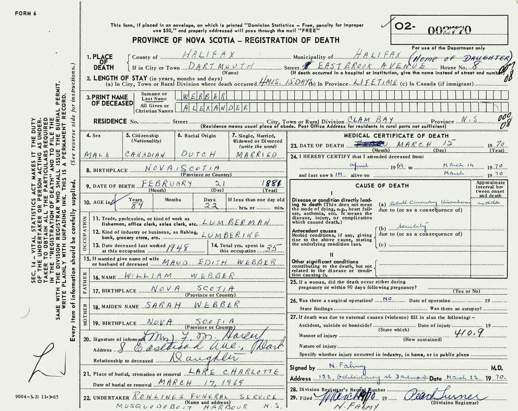 PROVINCE OF NOVA SCOTIA — REGISTRATION OF DEATH