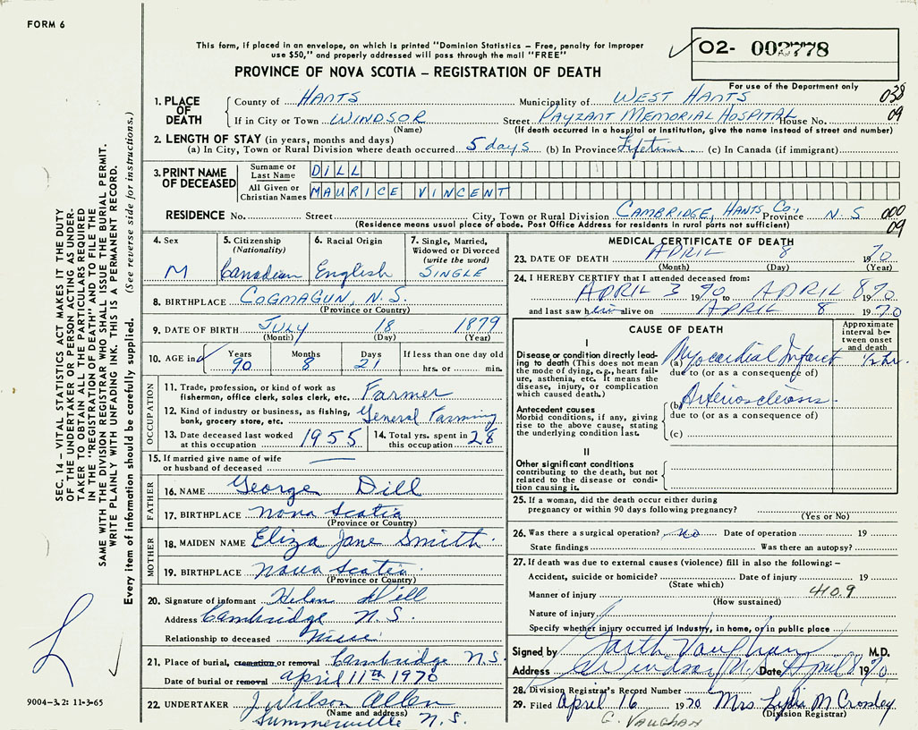 PROVINCE OF NOVA SCOTIA — REGISTRATION OF DEATH