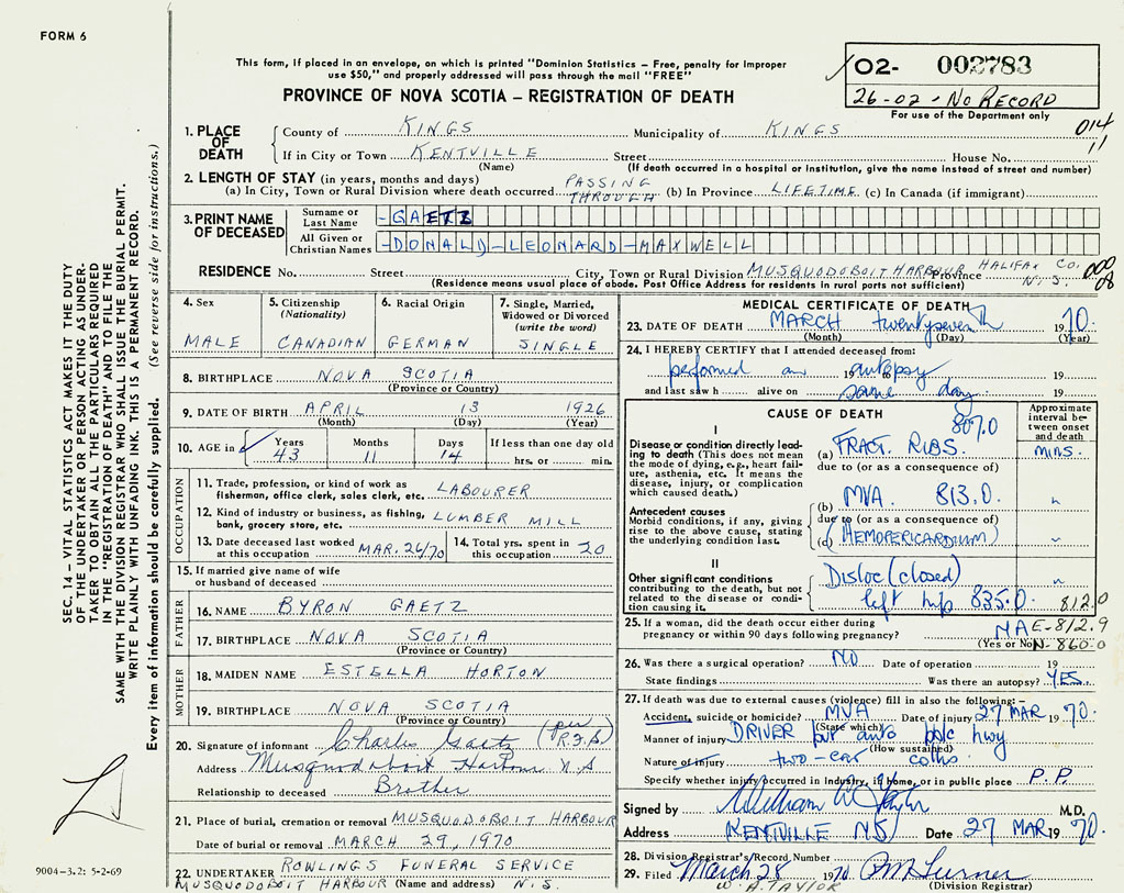 PROVINCE OF NOVA SCOTIA — REGISTRATION OF DEATH