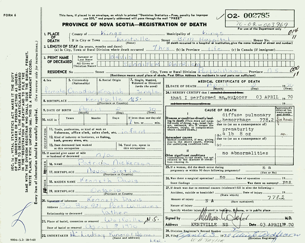 PROVINCE OF NOVA SCOTIA — REGISTRATION OF DEATH