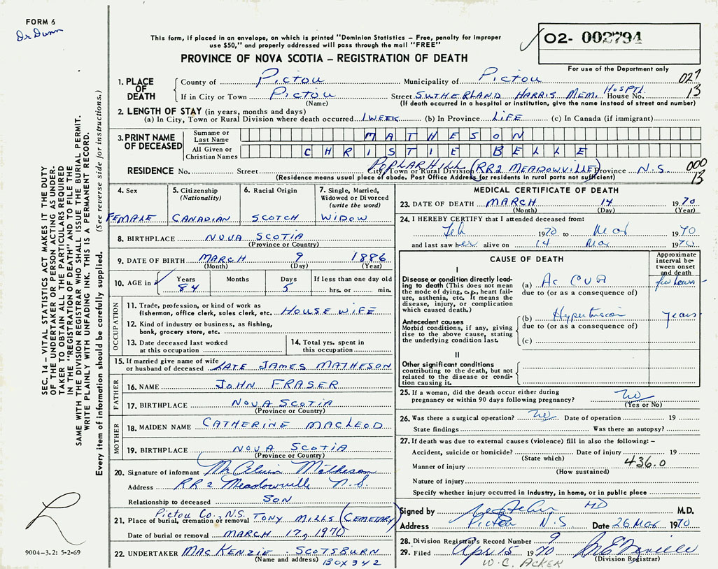 1. PLACE OF DEATH County of Pictou If in City or Town Pictou