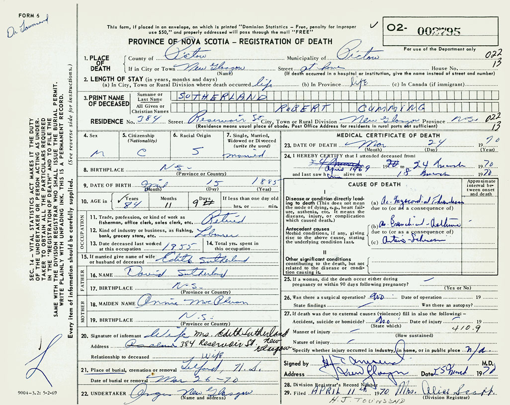 PROVINCE OF NOVA SCOTIA — REGISTRATION OF DEATH
