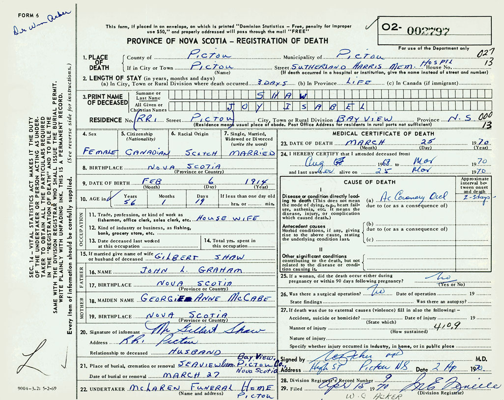 1. PLACE OF DEATH County of Pictou If in City or Town Pictou