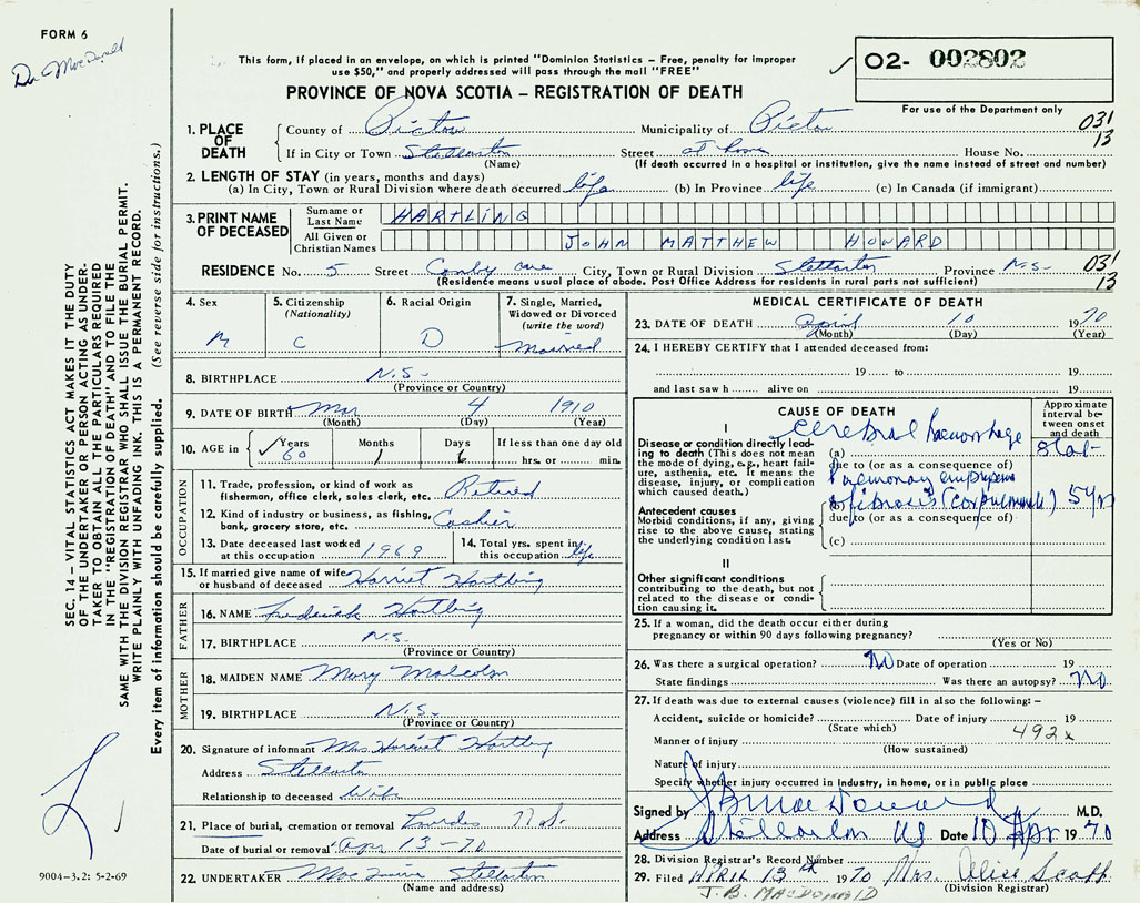 PROVINCE OF NOVA SCOTIA — REGISTRATION OF DEATH