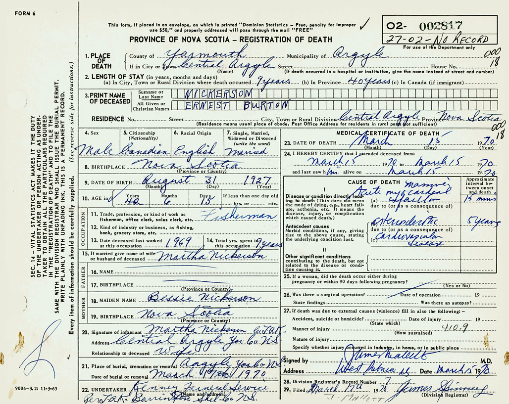 PROVINCE OF NOVA SCOTIA — REGISTRATION OF DEATH