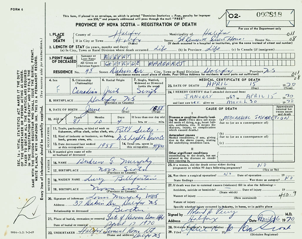 PROVINCE OF NOVA SCOTIA — REGISTRATION OF DEATH