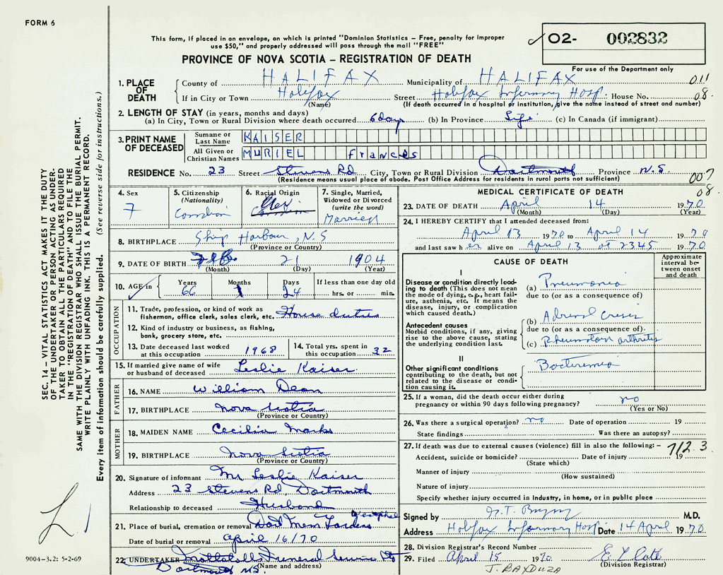 PROVINCE OF NOVA SCOTIA — REGISTRATION OF DEATH