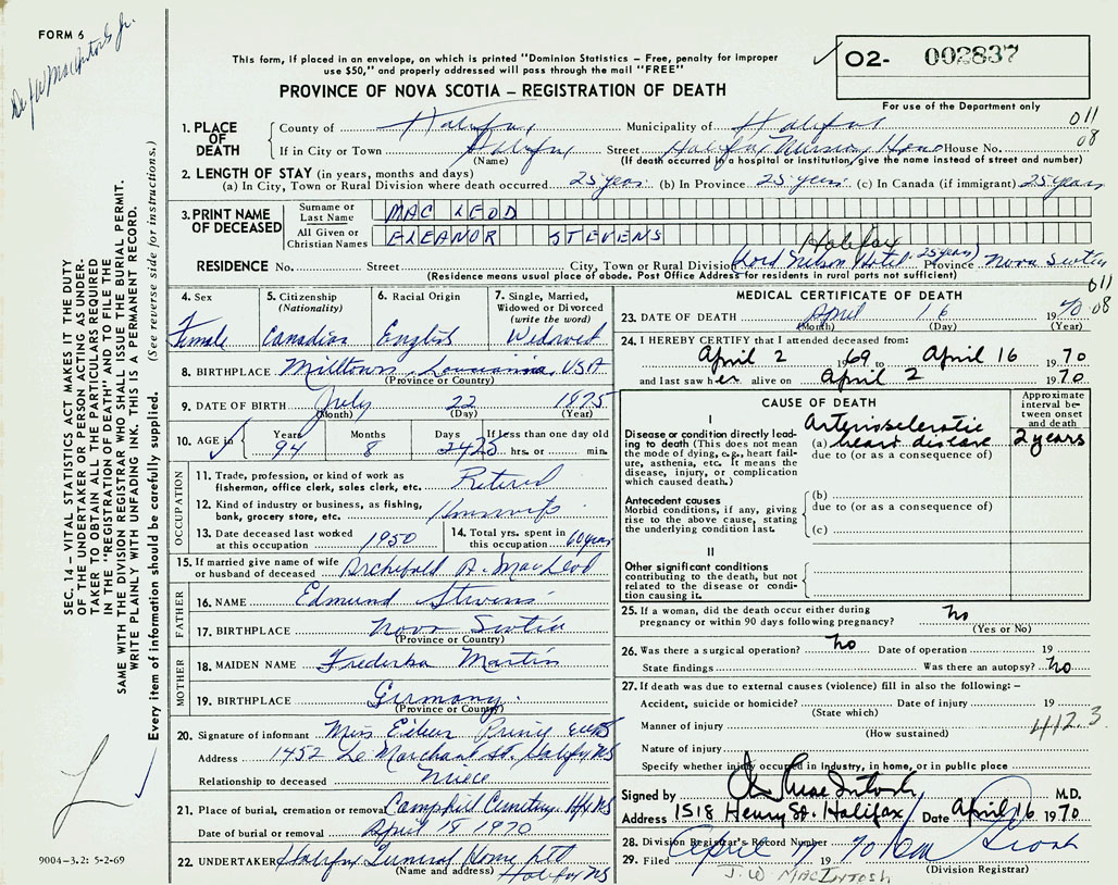 PROVINCE OF NOVA SCOTIA — REGISTRATION OF DEATH