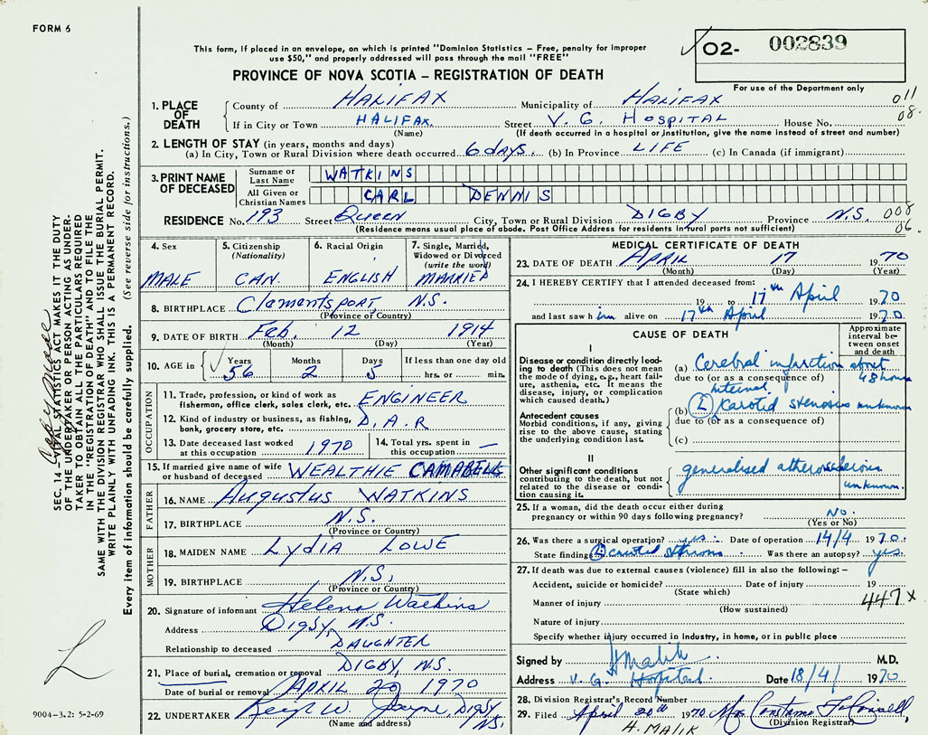 PROVINCE OF NOVA SCOTIA — REGISTRATION OF DEATH
