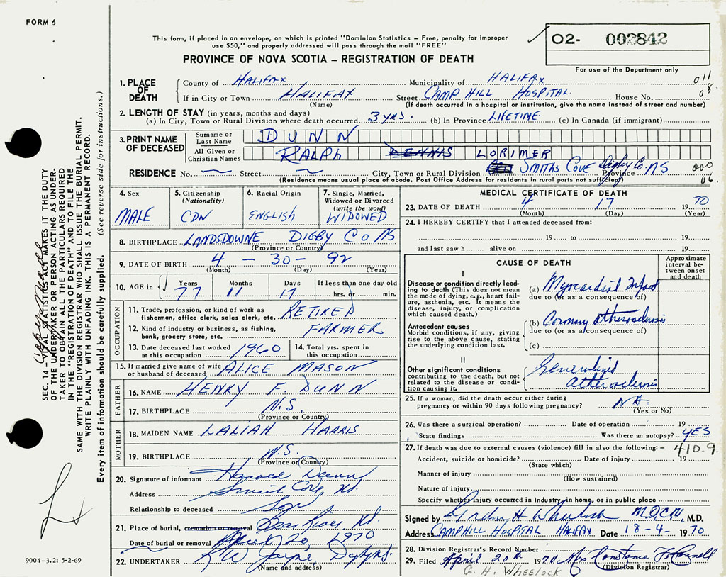 PROVINCE OF NOVA SCOTIA — REGISTRATION OF DEATH