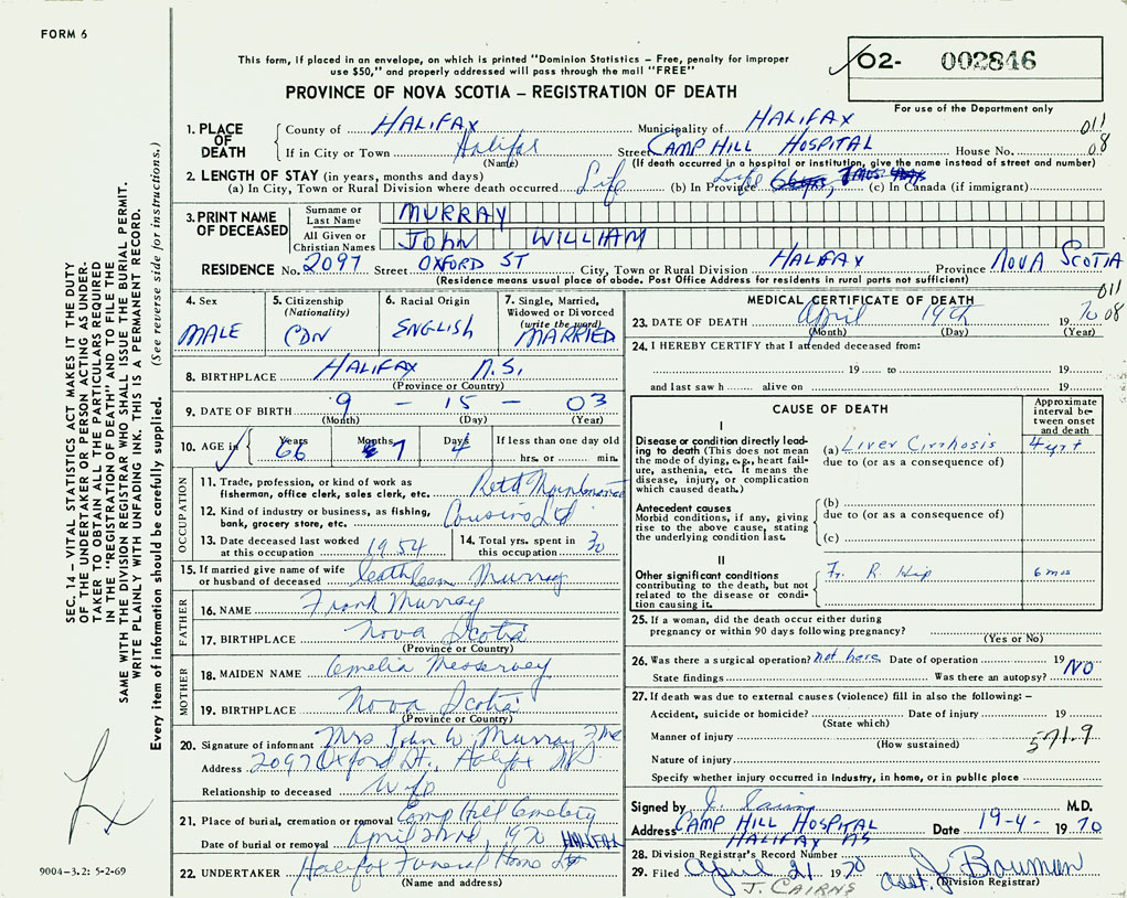 PROVINCE OF NOVA SCOTIA — REGISTRATION OF DEATH