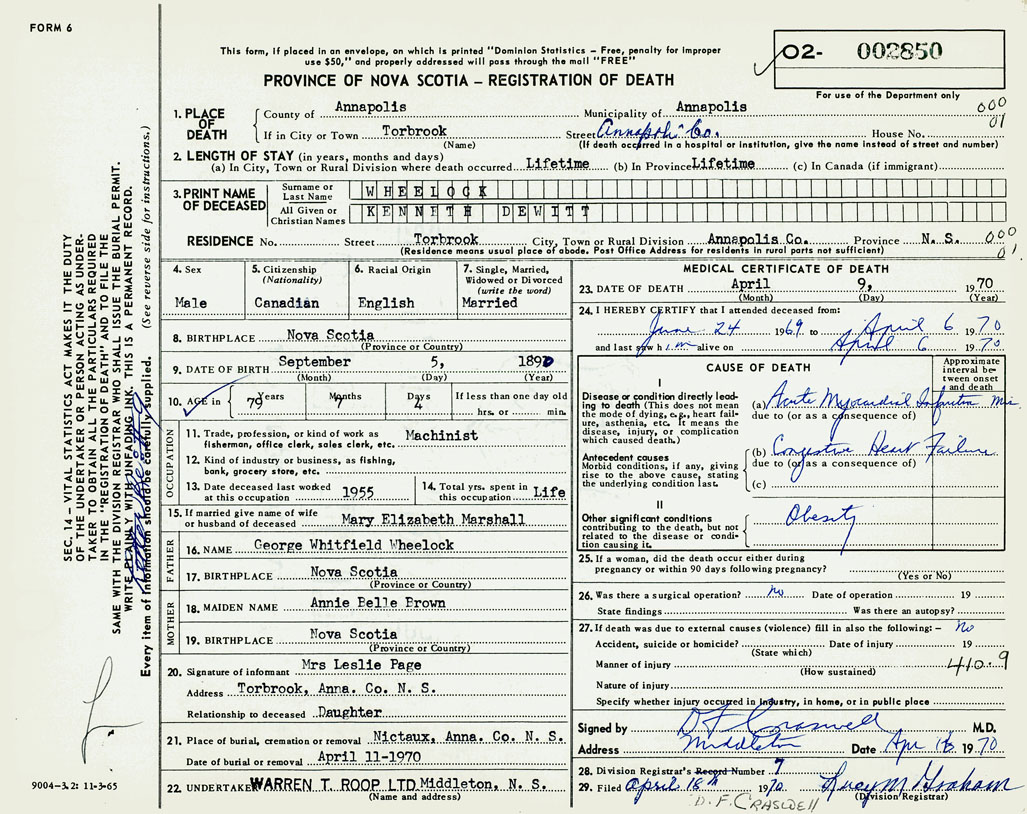 PROVINCE OF NOVA SCOTIA — REGISTRATION OF DEATH