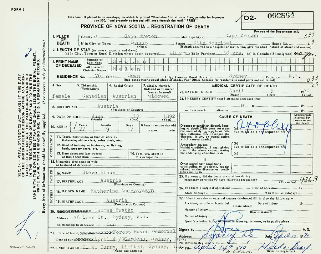 1. PLACE OF DEATH County of Cape Breton If in City or Town Sydney
