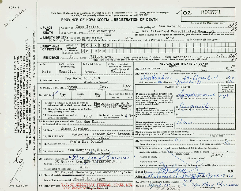 22. Undertaker V. J. Mc Gillivray Funeral Homes LTD. New Waterford