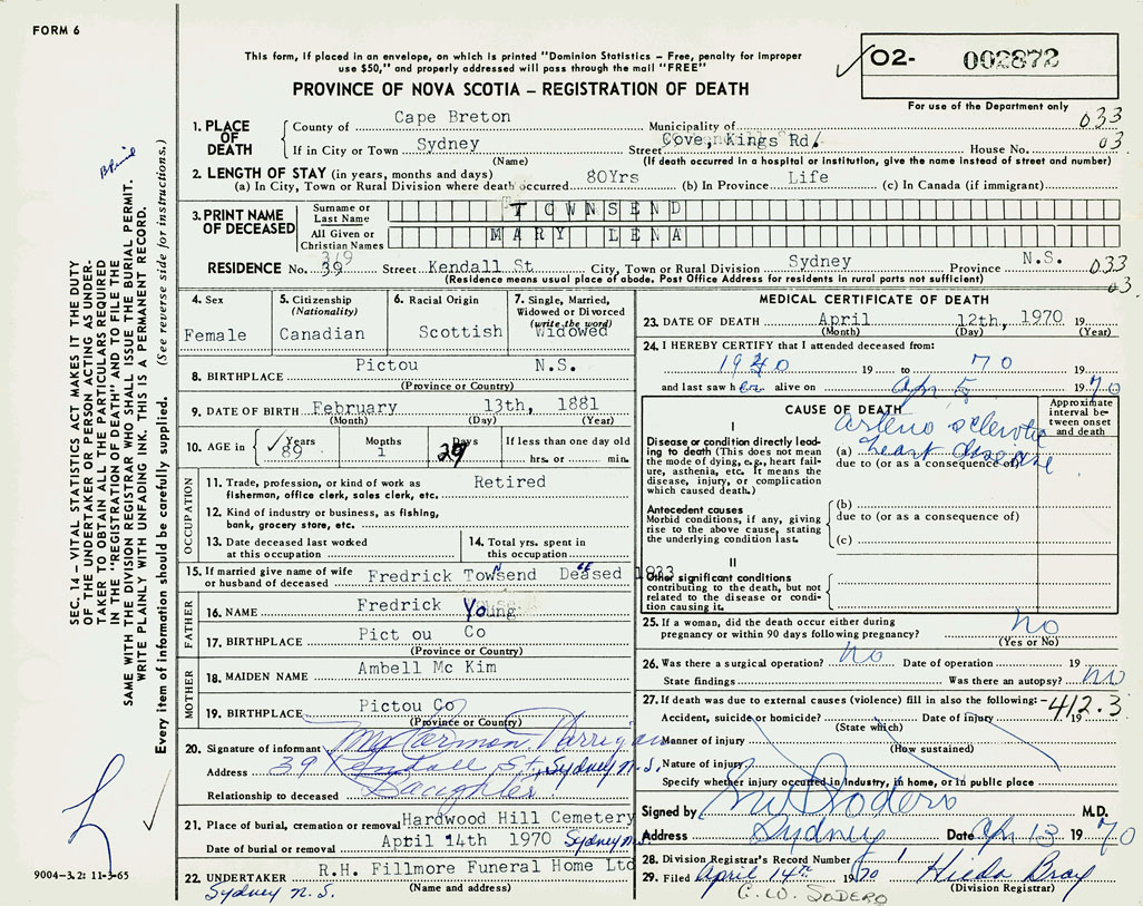 1. PLACE OF DEATH County of Cape Breton If in City or Town Sydney