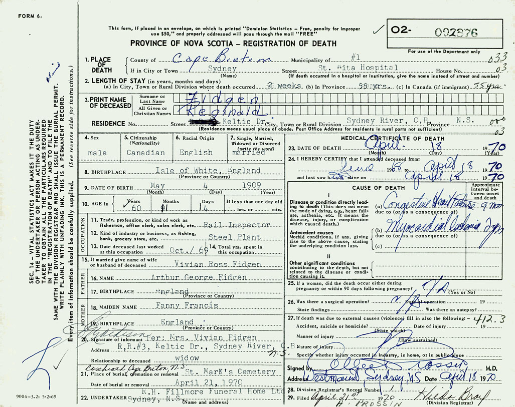 1. PLACE OF DEATH County of Cape Breton If in City or Town Sydney