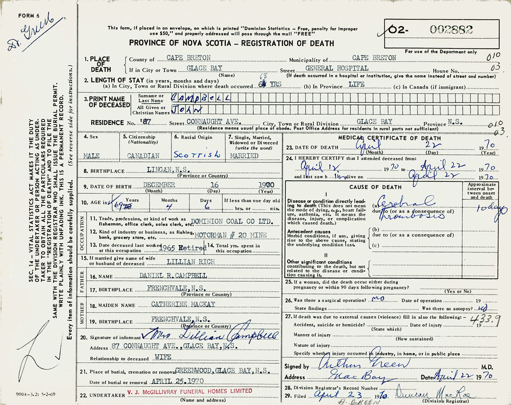 1. PLACE OF DEATH County of Cape Breton If in City or Town Glace Bay