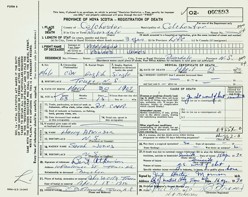 PROVINCE OF NOVA SCOTIA — REGISTRATION OF DEATH