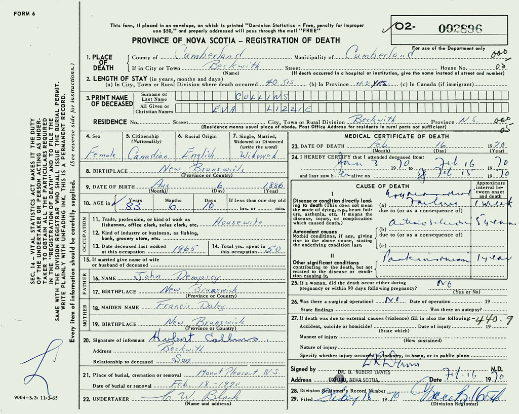 PROVINCE OF NOVA SCOTIA — REGISTRATION OF DEATH