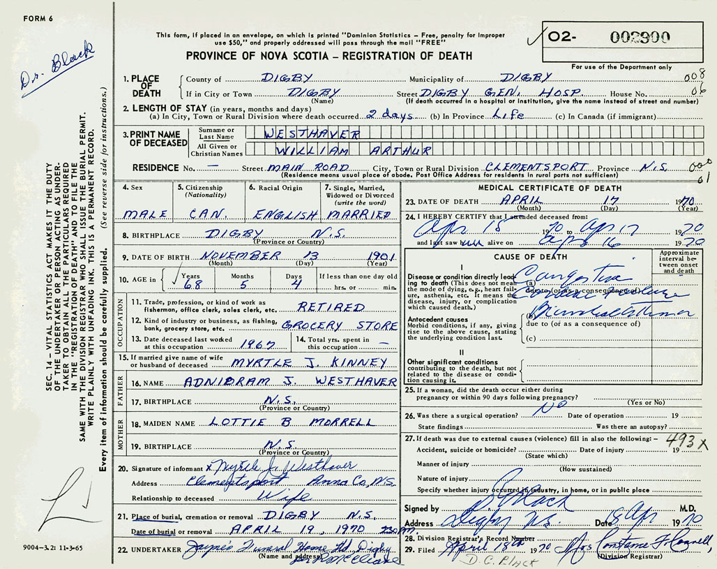 PROVINCE OF NOVA SCOTIA — REGISTRATION OF DEATH