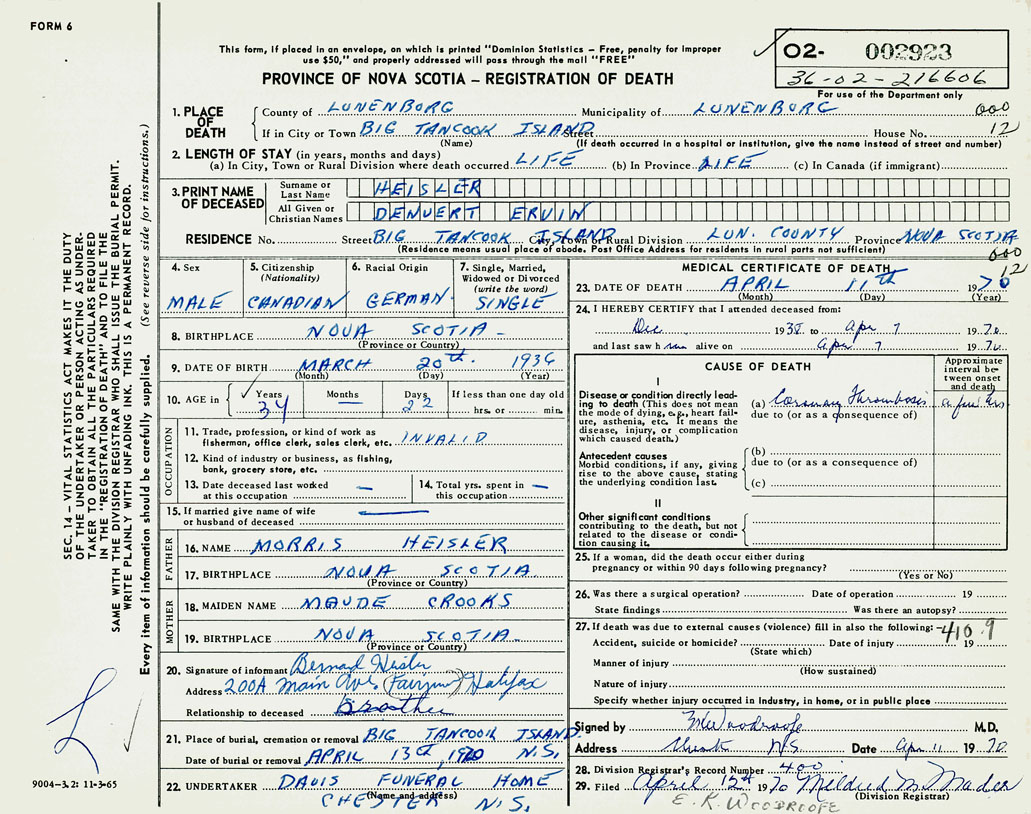 1. PLACE OF DEATH County of Lunenburg If in City or Town Big Tancook Island