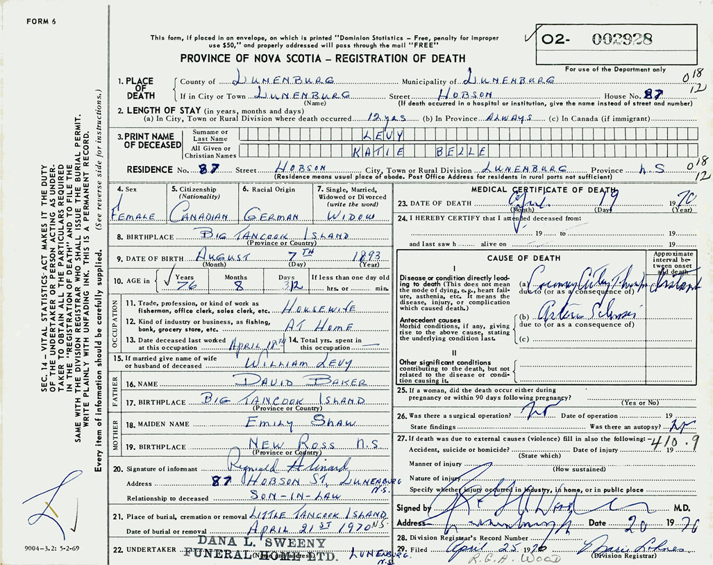 21. Place of burial Little Tancook Island