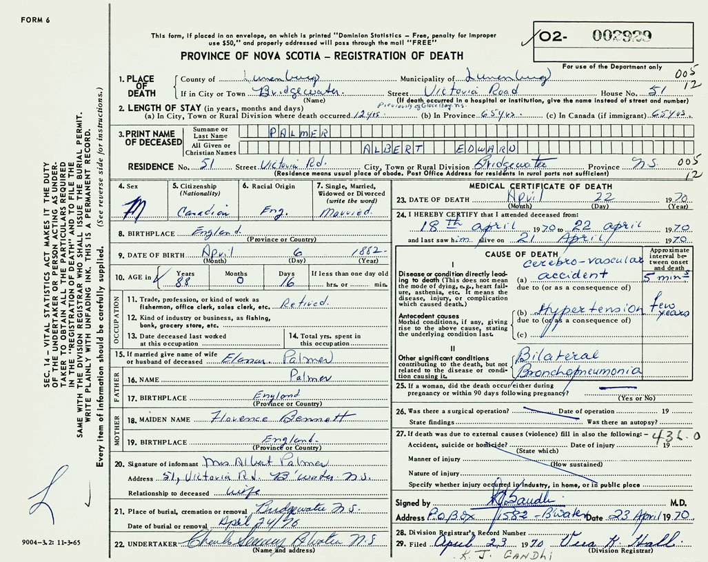 PROVINCE OF NOVA SCOTIA — REGISTRATION OF DEATH