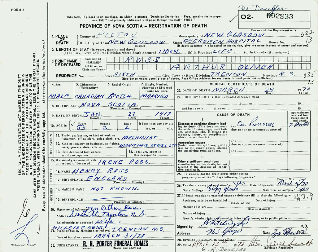 PROVINCE OF NOVA SCOTIA — REGISTRATION OF DEATH