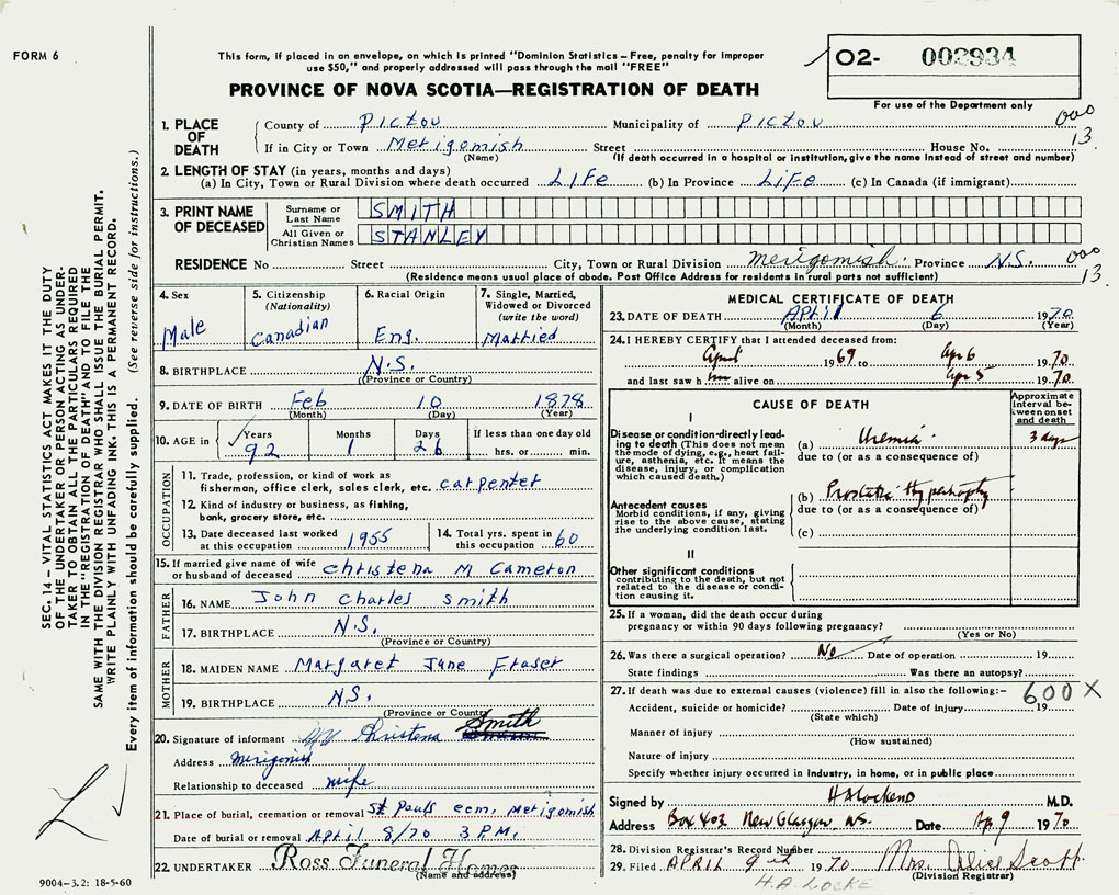 PROVINCE OF NOVA SCOTIA — REGISTRATION OF DEATH