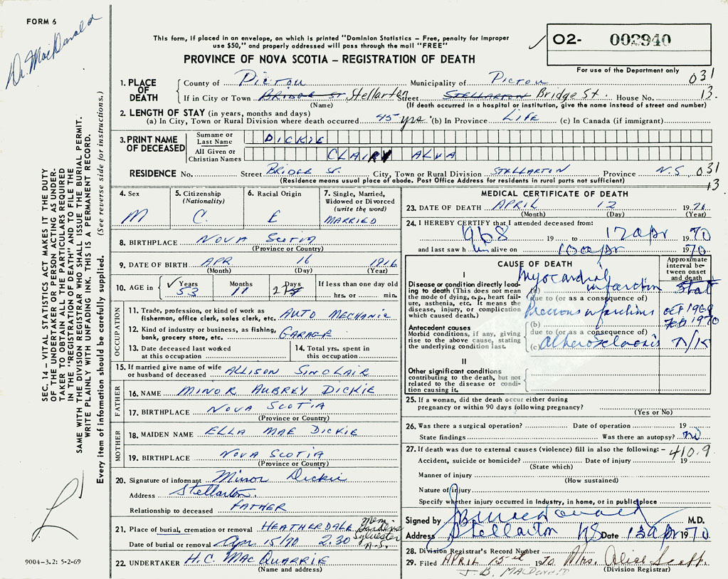 PROVINCE OF NOVA SCOTIA — REGISTRATION OF DEATH