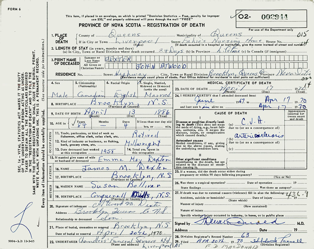 PROVINCE OF NOVA SCOTIA — REGISTRATION OF DEATH
