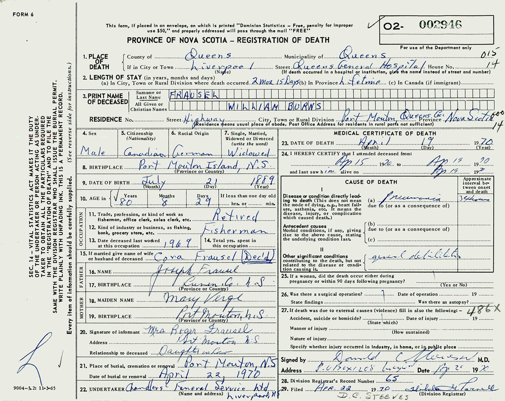 PROVINCE OF NOVA SCOTIA — REGISTRATION OF DEATH