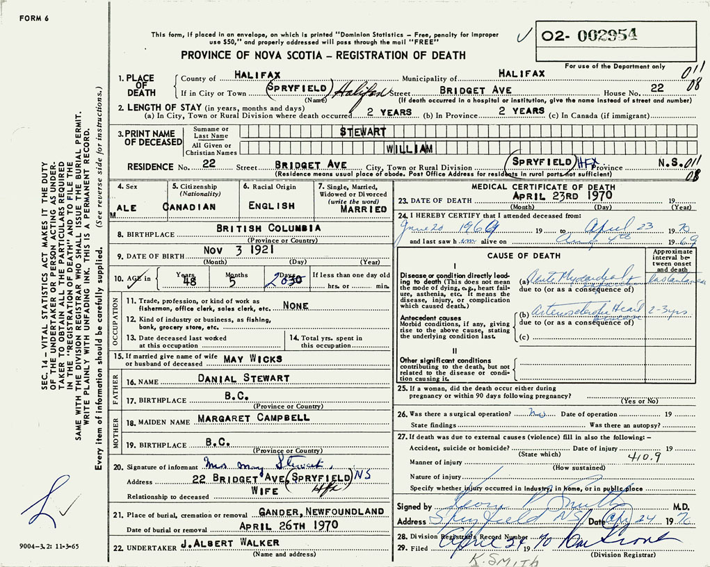 PROVINCE OF NOVA SCOTIA — REGISTRATION OF DEATH