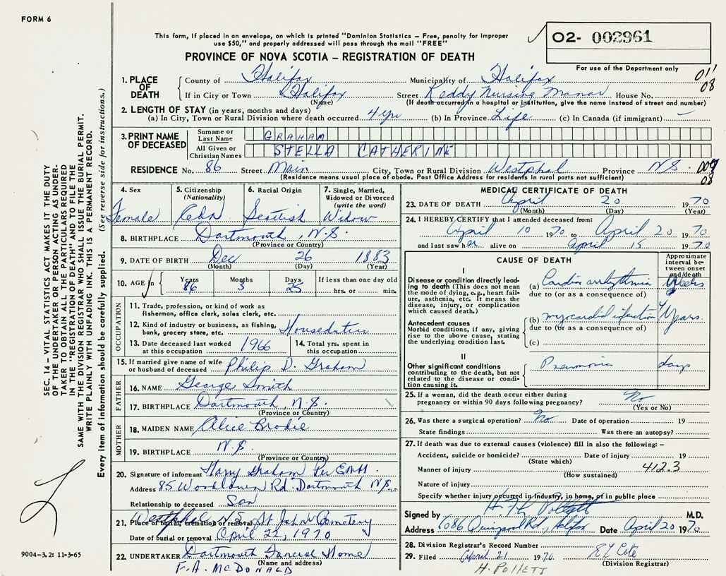 PROVINCE OF NOVA SCOTIA — REGISTRATION OF DEATH