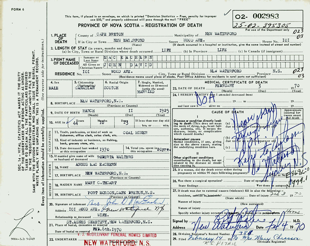 1. PLACE OF DEATH County of Cape Breton If in City or Town New Waterford